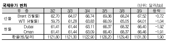 3월9일 국제유가는 최근 급등에 따른 매도 증가 영향으로 하락했다. 3월9일 국제유가는 가파른 상승 이후 이익 실현을 위한 매도가 증가한 영향으로 하락했다. 표, 그래프: <국제유가 변화> <화학저널 2021/03/10> |