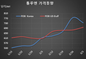 표, 그래프: <톨루엔 가격동향> <화학저널 2021/03/10> |