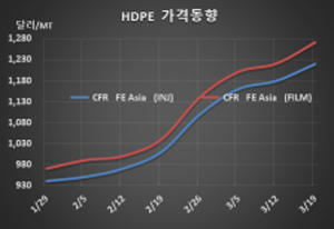 표, 그래프: <HDPE 가격동향> <화학저널 2021/03/22> |
