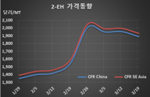 표, 그래프: <2-EH 가격동향> <화학저널 2021/03/23> |