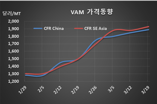 초산(Acetic Acid)은 폭락세 전환이 우려된다. 초산 시세는 3월18일 CFR FE Asia 955달러, CFR SE Asia 940달러로 변동이 없었으나 CFR S Asia는 890달러로 70달러 폭락했다. 표, 그래프: <VAM 가격동향> <화학저널 2021/03/26> |