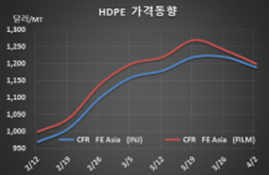 표, 그래프: <HDPE 가격동향> <화학저널 2021/04/05> |