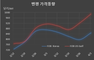 표, 그래프: <Benzene 가격동향> <화학저널 2021/04/07> |