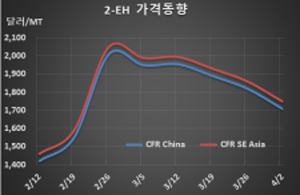 표, 그래프: <Butanol 가격동향, 2-EH 가격동향> <화학저널 2021/04/09> |