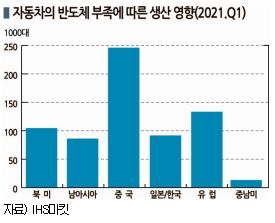 IHS마킷은 자동차 반도체 수급 불균형이 2021년 3분기까지 계속되고 1분기에만 67만2000대에 달하는 자동차 생산 차질이 발생할 것으로 내다보고 있다.
