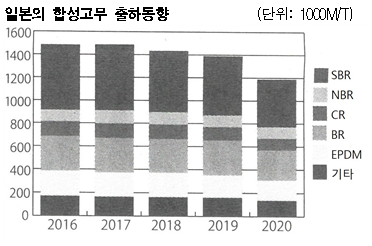 일본은 합성고무 생산량이 크게 줄어든 것으로 파악된다. 표, 그래프: <일본의 합성고무 출하동향> <화학저널 2021/04/13> |