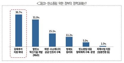 국내기업 10곳 중 7곳 이상은 정부의 2050 탄소중립 정책이 경쟁력을 약화시킬 수 있다고 우려하는 것으로 나타났다. 표, 그래프: <(그림3) 탄소중립 위한 정부의 정책과제는?> <화학저널 2021/04/19> |