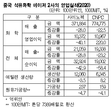 중국의 양대 화학 메이저가 코로나19(신종 코로나바이러스 감염증) 사태로 수익성에 타격을 받았다. 표, 그래프: <중국 석유화학 메이저 2사의 영업실적(2020)> <화학저널 2021/04/23> |