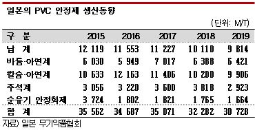PVC(Polyvinyl Chloride)는 내구성, 내후성, 가공성 등이 뛰어나 다양한 용도로 활용되고 있으나, PVC 안정제와 가소제는 2020년 코로나19(신종 코로나바이러스 감염증)의 영향으로 PVC 출하량이 감소함과 동시에 수요가 침체된 것으로 나타났다. 표, 그래프: <일본의 PVC 출하동향, 일본의 PVC 안정제 생산동향> <화학저널 2021년 4월 26일> |