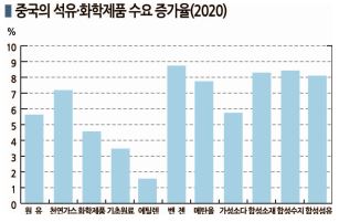화학원료 및 화학제품 제조에 대한 투자는 2020년 초 전년동기대비 33.0% 급감했으나 서서히 회복돼 2020년 전체로는 1.2% 감소하는데 그쳤다.