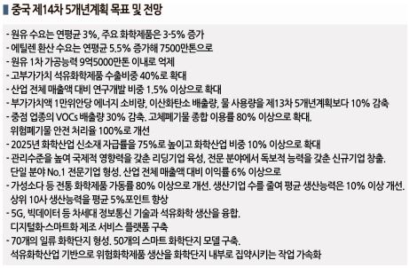 국제적인 경쟁력을 갖춘 석유‧화학기업과 산업단지를 육성해 2025년 말까지 생산효율과 경제적인 효율, 국제 경쟁력을 향상시키고 산업 전체 매출액 대비 이익률을 6% 이상으로 개선하겠다는 목표를 설정하고 있다.
