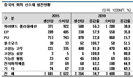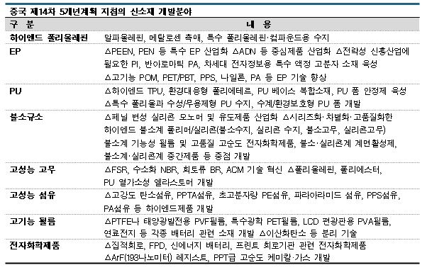 특히, 항공우주와 전자정보, 신에너지, 자동차, 궤도교통, 에너지 절감 및 환경보호, 의료건강, 국방 등 산업 고도화를 타고 하이엔드 화학 신소재 수요가 증가할 것으로 기대하고 있다.
