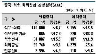 또 하반기 들어 에너지‧화학제품 생산이 회복됐으나 2020년 전체로는 석유‧천연가스 채굴 가격이 27.4%, 화학원료 및 화학제품 제조는 5.9% 하락해 타격이 불가피했다고 분석하고 있다.
