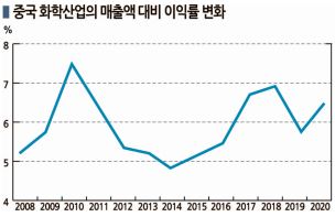 그러나 파인케미칼 호조를 타고 화학산업 전체 매출액 대비 이익률은 제13차 5개년계획 기간 동안 평균 6.3%를 기록하는 등 양호한 수익성을 유지했다.