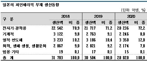 일본 파인세라믹협회가 발표한 2020년 파인세라믹산업 조사에 따르면, 일본 시장은 세계적으로 맹위를 떨치고 있는 코로나19 확산의 영향을 받아 2조8000억엔으로 8.1% 감소했다.