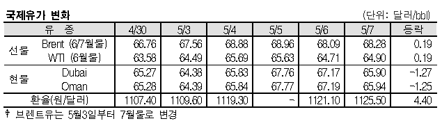 5월7일 국제유가는 미국 달러화 약세 영향으로 상승했다. 5월7일 국제유가는 미국 달러화 약세에 영향을 받아 상승했다. 표, 그래프: <국제유가 변화> <화학저널 2021/05/10> |