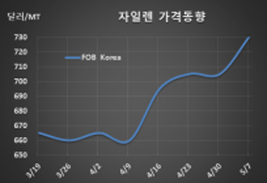 표, 그래프: <자일렌 가격동향> <화학저널 2021/05/13> |