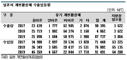 일본은 2018년 계면활성제 생산량이 120만9613톤으로 수요가 가장 많았던 1992년 수준에 육박했으나 2019년에는 전년대비 9% 감소했다.