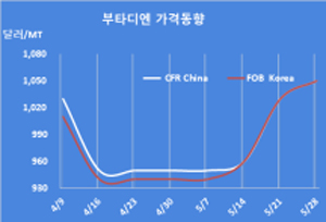 부타디엔(Butadiene)은 미국 수출의 영향으로 오름세를 계속했다.