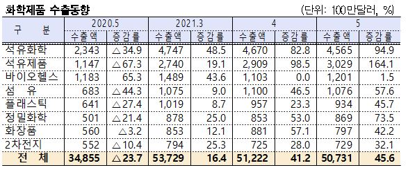 5월 수출액이 2020년 5월에 비해 45.6% 급증하며 32년만에 최고 성장률을 나타냈다. 표, 그래프: <화학제품 수출동향> <화학저널 2021/06/01> |