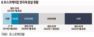포스코케미칼은 양극재 광양공장 3만톤 증설에 2758억원을 투자한다. 광양공장에 대한 4단계 확장으로 NCMA(니켈·코발트·망간·알루미늄) 양극재 대량 수주에 대응하기 위한 것이다.