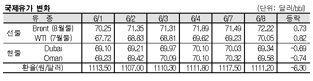 6월8일 국제유가는 이란의 핵협상 교착 가능성 영향으로 상승했다. 6월8일 국제유가는 이란 핵협상이 교착될 가능성에 영향을 받아 상승했다. 표, 그래프: <국제유가 변화> <화학저널 2021/06/09> |