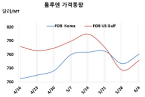 표, 그래프: <톨루엔 가격동향> <화학저널 2021/06/09> |