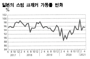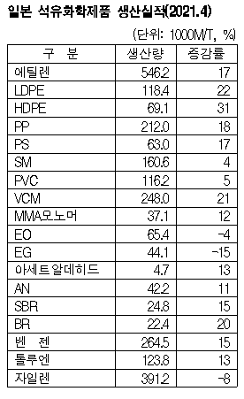 일본이 석유화학제품 공급을 확대하고 있다. 표, 그래프: <일본 석유화학제품 생산실적(2021.4), 일본의 스팀 크래커 가동률 변화> <화학저널 2021/06/14> |