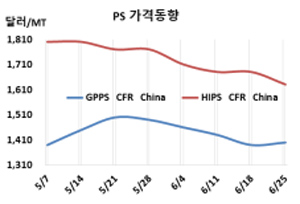 PS(Polystyrene)는 전자용 그레이드가 폭락했다.