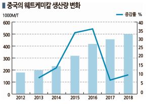 중국 전자소재공업협회에 따르면, 중국은 웨트케미칼 생산량이 2012년 18만7000톤에서 2018년 49만5000톤으로 확대해 연평균 17.6% 성장한 것으로 나타났다.