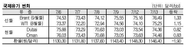 7월13일 국제유가는 수급 불균형에 대한 우려 영향으로 상승했다. 7월13일 국제유가는 OPEC(석유수출국기구)+의 교착 상태가 장기화되면 글로벌 석유 시장의 수급 불균형이 심화될 것으로 예상됨에 따라 상승했다. 표, 그래프: <국제유가 변화> <화학저널 2021/07/14> |