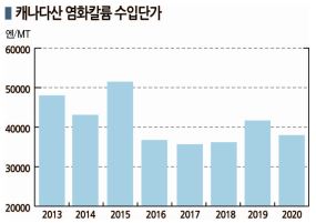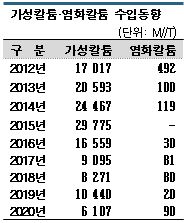 염화칼륨은 2020년 수입량이 43만6628톤으로 10.8% 감소했다.