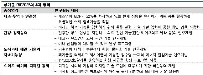 RIE2025는 △제조·무역과 연결성 △건강‧잠재능력 △도시과제 해결 기술과 지속가능성 △스마트 국가와 디지털 경제 등 4개 영역에 무게를 두고 있다.