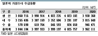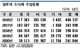 일본은 2020년 소다회 수입량이 24만1844톤으로 39.4% 급감했다.