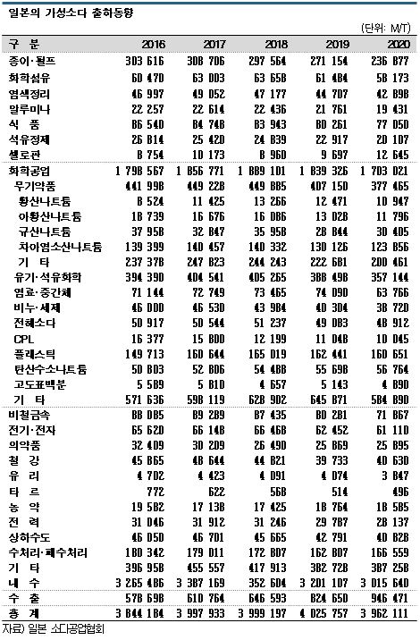 일본은 2020년 가성소다 수출이 94만6471톤으로 14.8% 급증했다. 다만, 액상제품은 196만3430톤으로 19.5% 급증한 반면 고형제품은 7496톤으로 6.3% 감소했다.