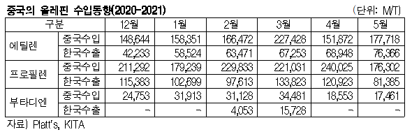 표, 그래프: <중국의 올레핀 수입동향(2020-2021)> <화학저널 2021/07/27> |