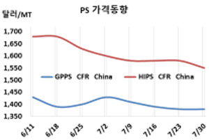 HIPS, CFR China 1550달러로 30달러 하락 … 벤젠‧SM 급락 겹쳐