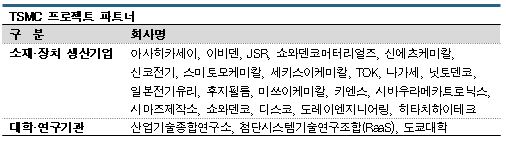 TSMC 프로젝트에서는 방열소재와 인터포저 소재를 생산하는 신에츠케미칼, 재배선 소재에 강한 아사히카세이와 후지필름(Fujifilm), JSR, 고기능 IC 패키지 기판 분야 1위인 이비덴 등이 기술 분야에서 협력한다.
