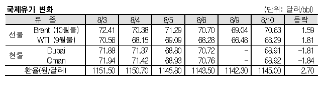 8월10일 국제유가는 미국의 인프라 투자 법안 통과 영향으로 급등했다. 8월10일 국제유가는 미국 인프라 투자 법안이 상원을 통과한 영향으로 급등했다. 표, 그래프: <국제유가 변화> <화학저널 2021/08/11> |