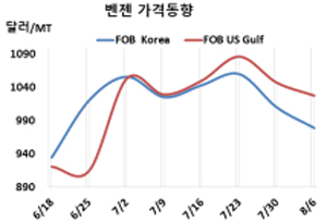 표, 그래프: <Benzene 가격동향> <화학저널 2021/08/11> |
