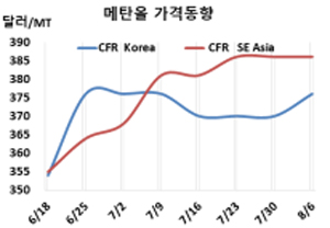 메탄올(Methanol)은 한국 수입가격만 상승했다.
