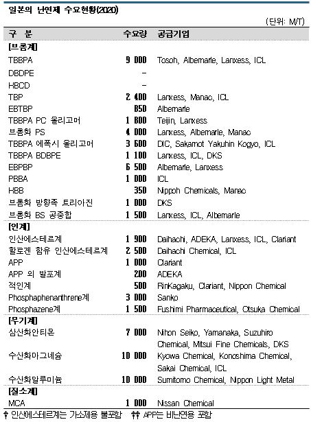 일본은 2020년 브롬계 난연제 수요가 사상 최대치를 기록한 2004년에 비해 약 30% 급감한 것으로 파악된다.