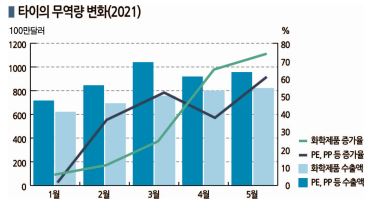 타이는 2021년 5월 PE(Polyethylene), PP(Polypropylene) 등 합성수지 수출이 전년동월대비 61.4% 늘어났고 화학제품 전체 수출은 73.8% 급증한 것으로 파악된다.