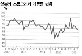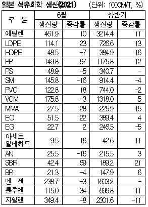 일본 석유화학산업이 코로나19(신종 코로나바이러스 감염증) 사태 이전 수준을 되찾았다. 표, 그래프: <일본의 스팀크래커 가동률 변화, 일본 석유화학 생산(2021)> <화학저널 2021/08/23> |