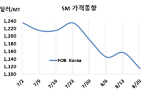 SM 시세는 8월20일 FOB Korea 톤당 1115달러로 42달러 하락했고 CFR SE Asia도 1143달러로 44달러 떨어졌다. CFR India 역시 1165달러로 45달러 하락했다.