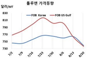 톨루엔(Touene)은 700달러대 초중반으로 떨어졌다.