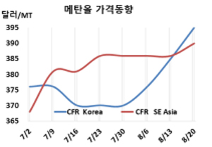 표, 그래프: <Methanol 가격동향> <화학저널 2021/08/27> |