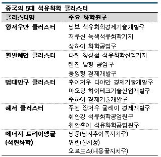 클러스터는 △닝보(Ningbo), 저우산(Zhoushan), 상하이(Shanghai)를 중심으로 한 항저우(Hangzhou)만 클러스터 △다롄(Dalian) 창싱섬(Changxing Island), 톈진(Tianjin) 남항, 둥잉(Dongying) 등 환발해만 석유화학 클러스터 △후이저우(Huizhou) 다야(Daya)만을 중심으로 한 범대만구 석유화학 클러스터 △푸젠(Fujian)의 장저우(Zhangzhou), 취안강(Quangang), 취안후이(Quanhui) 등 해서 석유화학 클러스터 △닝둥(Ningdong), 위린(Yulin), 오르도스 등 석탄화학 클러스터 5개이다.