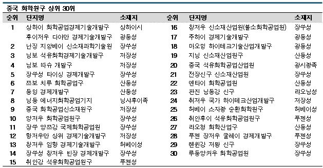 전체 616곳 가운데 국가급 화학공업원은 48곳이고 생산액이 1000억위안(약 17조원) 이상인 초대형 공업원은 17곳, 생산액 500억-1000억위안 대형 공업원은 35곳으로 파악되고 있다.