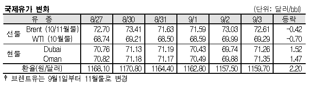9월3일 국제유가는 미국의 고용지표 부진 영향으로 하락했다. 9월3일 국제유가는 미국의 고용지표가 예상보다 부진한 영향으로 하락했다. 표, 그래프: <국제유가 변화> <화학저널 2021/09/06> |